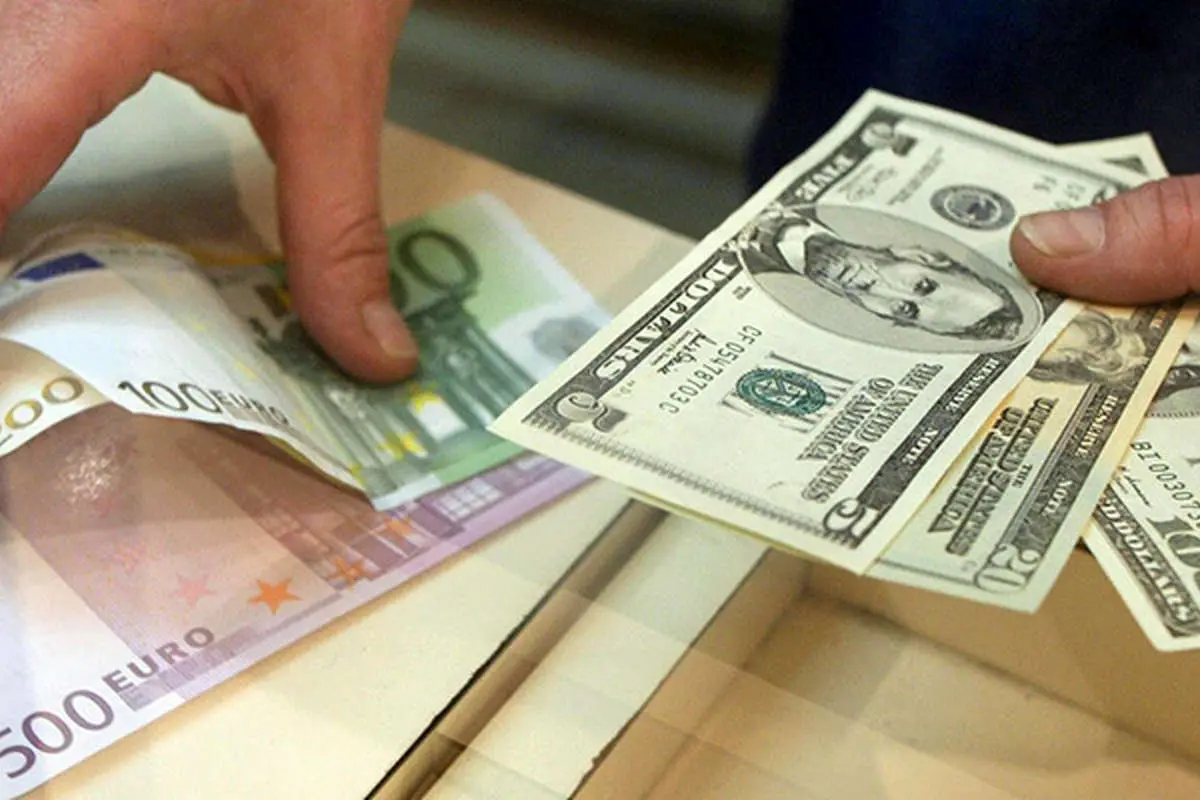 تبادل اسکناس دلار آمریکا و یورو روی پیشخوان صرافی، تمرکز روی دستها و پولها.