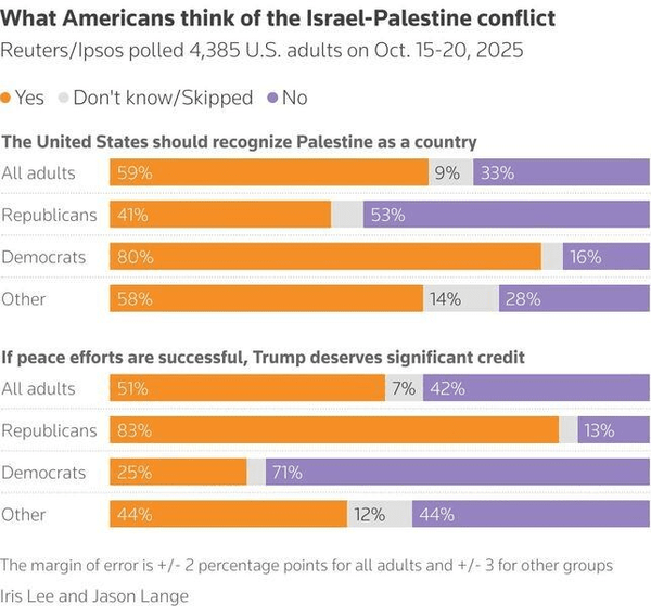 اکثر آمریکاییهای شرکتکننده در نظرسنجی جدید رویترز/ایپسوس شامل ۸۰ درصد دموکراتها و ۴۱ درصد جمهوریخواهان بر این باورند که ایالات متحده باید فلسطین را به رسمیت بشناسد؛ نتایجی که نشان میدهد افکار عمومی آمریکا با موضع ترامپ در این خصوص همراستا نیست.در این نظرسنجی شش روزه که دوشنبه به پایان رسید، ۵۹ درصد آمریکاییها از بهرسمیتشناختن دولت فلسطین توسط کشورشان حمایت کردند، در حالی که ۳۳٪ مخالف بودند.در هفتههای گذشته و پیش از برقراری آتشبس اخیر، شمار فزایندهای از کشورها از جمله متحدان آمریکا مثل انگلیس، کانادا، فرانسه و استرالیا فلسطین را به رسمیت شناختند؛ اما ترامپ که در جریان جنگ غزه، حامی جنایات اسرائیل بوده، همسو با این رژیم، با چنین اقدامی مخالف است.